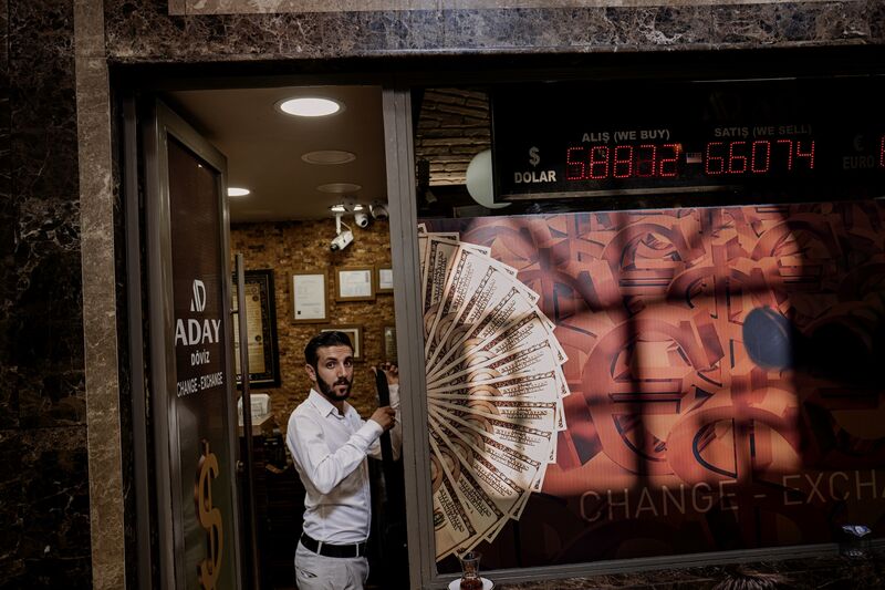 Un hombre mira desde una oficina de cambio de moneda en Estambul el 10 de agosto.Fotógrafo: Ismail Ferdous / Bloomberg