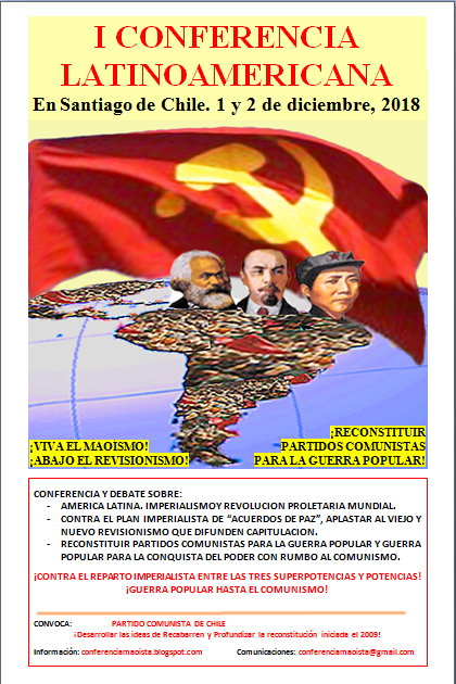 El 1-2 de diciembre de 2018 se ha realizado exitosamente la I Conferencia Latinoamericana en Chile, convocada por el Partido Comunista de Chile. El evento ha servido a desarrollar el debate sobre puntos decisivos para el Movimiento Comunista Internacional, en el espíritu del internacionalismo proletario y de lucha implacable contra el revisionismo de viejo y de nuevo cuño. Nosotros, los firmantes de la presente Declaración, extendemos nuestros calurosos saludos comunistas a todos los comunistas y revolucionarios del mundo; a las heroicas masas que dan sus vidas en las guerras populares y luchas armadas, así como en todas las luchas heroicas del proletariado y de los pueblos oprimidos contra el imperialismo, la reacción y el revisionismo. Como producto de este exitoso evento publicamos la presente Declaración conjunta resumiendo los temas tratados.