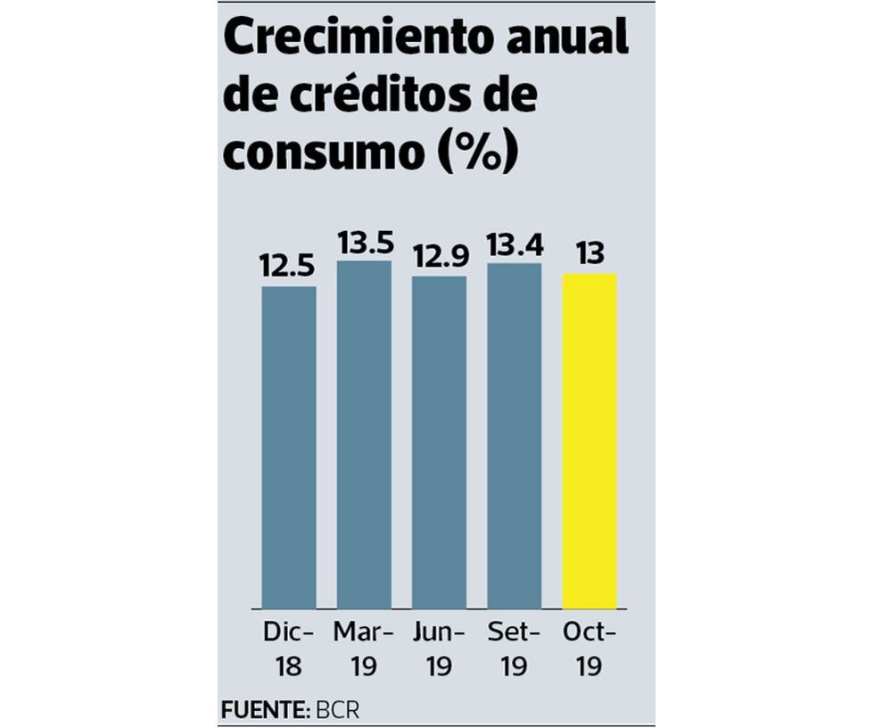 A octubre último, los préstamos de consumo otorgados por las entidades financieras sumaron S/ 78,976 millones, monto que representa una expansión de 13% respecto a igual periodo del 2018, según datos del Banco Central de Reserva (BCR). A la misma fecha, los créditos hipotecarios totalizaron S/ 51,636 millones, con un avance anual de 9%.