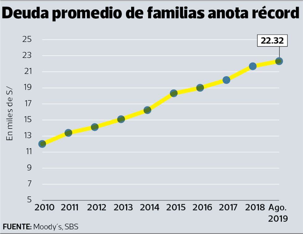 Un reciente reporte de Moody’s Investors Service señala que la deuda promedio de los hogares peruanos alcanzó en agosto de este año un nivel récord de S/ 22,300 (US$ 6,700). Desde el 2010, la deuda de las familias aumenta constantemente a una tasa de crecimiento anual compuesta de 6.4%, indica el informe.