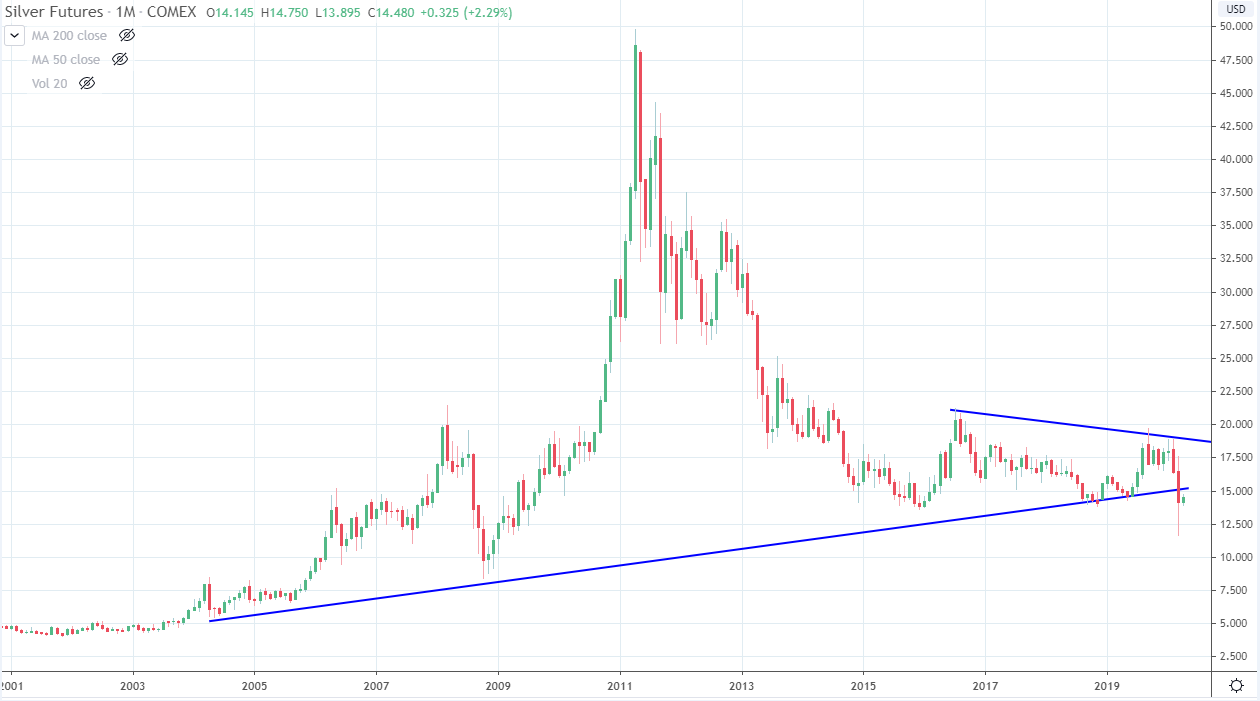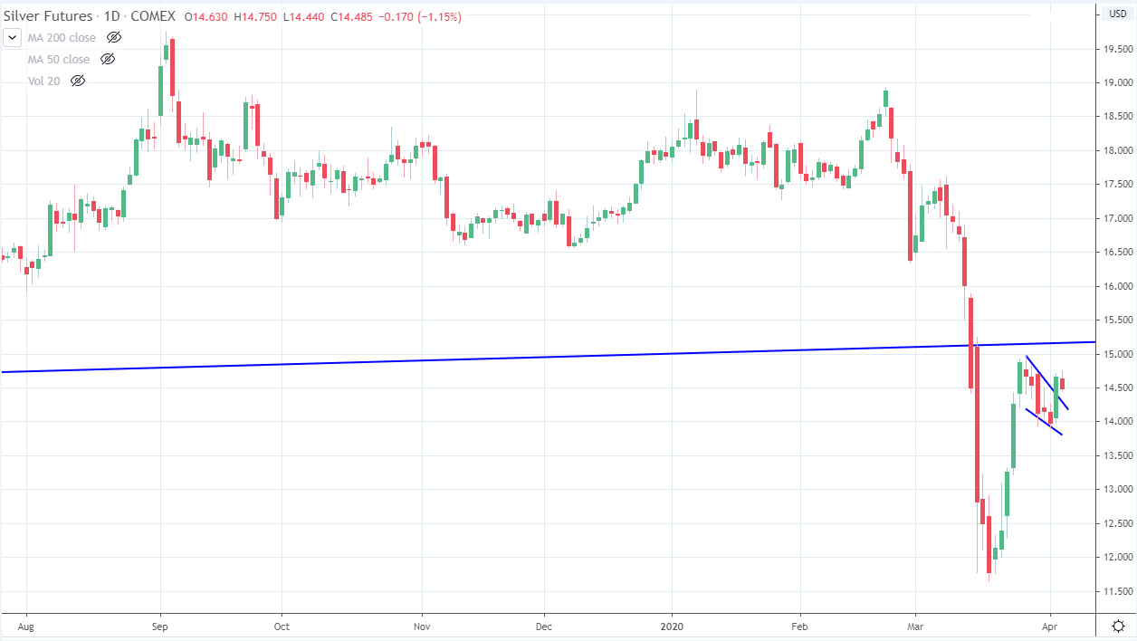 Tras el desmayo deflacionario, la plata rompió una línea de tendencia que data de 2001, como se ve en el cuadro a continuación. Sin embargo, su recuperación tiene un hermoso patrón de bandera alcista con el rally del 20 al 25 de marzo como el asta de la bandera y la consolidación en los próximos días como un patrón de bandera perfecto. Esto alinea un cierre necesario por encima de $ 15 en plata para no solo romper el patrón de bandera alcista, sino también para recuperar la línea de tendencia de 2001 y alimentar un rally masivo alcista en oro, uno al que esperaríamos que se uniera la plata.