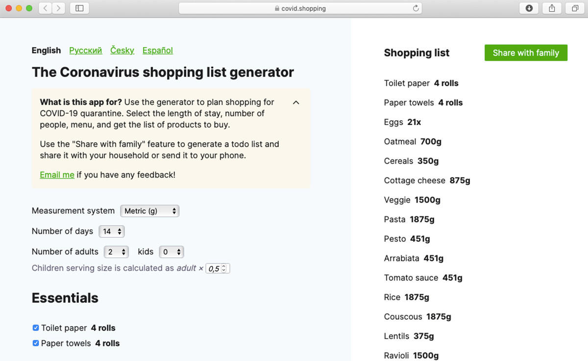 Covid Shopping es un sitio web que te ayuda a hacer una lista de compras óptima para un período de tiempo determinado. Lo que hay que hacer es introducir datos del número de días, el número de personas en casa y los menús que se quieren hacer. Con es información se configura la lista. Esta es una opción para aquellos que siempre sienten que “falta algo” o “que no será suficiente”.
