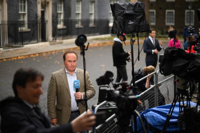Un periodista informa desde las afueras del número 10 de Downing Street en el centro de Londres el 21 de octubre de 2022.