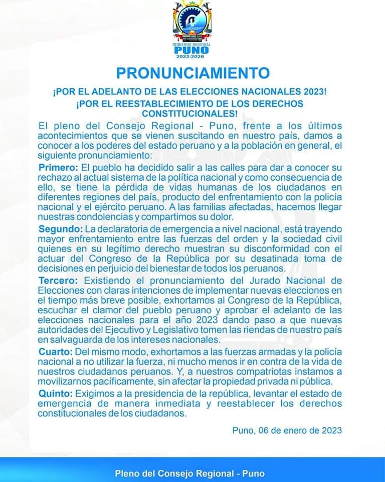 El gobierno regional de Puno emitió un comunicado para pedir el adelanto de elecciones en el 2023 y el rechazo al Estado de Emergencia Nacional.