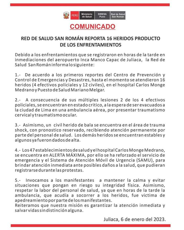 La Red de Salud San Román de Juliaca reportó 16 heridos por enfrentamiento registrados en inmediaciones del Aeropuerto Inca Manco Capac de Juliaca.