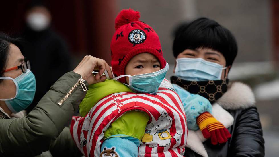 Una mujer pone una mascarilla a un bebé en Pekín, este domingo. En vídeo, más de 300 muertos en China, mientras disminuye el índice de gravedad. FOTO: AFP | VÍDEO: ATLAS