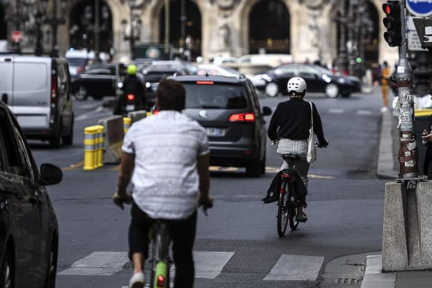 Una mujer pasa en bicicleta por un semáforo en rojo en París el 23 de septiembre de 2020.