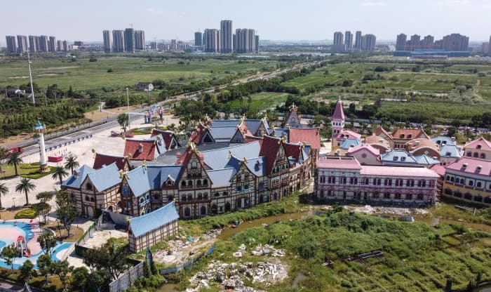 Esta foto aérea tomada el 17 de septiembre de 2021 muestra la ciudad de turismo cultural Evergrande, que se encuentra en construcción, un desarrollo residencial, minorista y de entretenimiento de uso mixto, en Taicang, ciudad de Suzhou, en la provincia de Jiangsu, en el este de China.