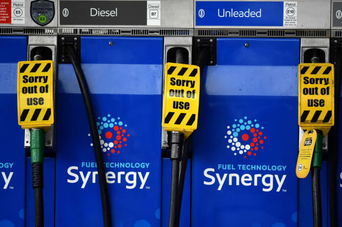 Los carteles de Fuera de uso cubren las bombas de combustible en una gasolinera en Paddock Wood, sureste de Inglaterra, el 27 de septiembre de 2021.