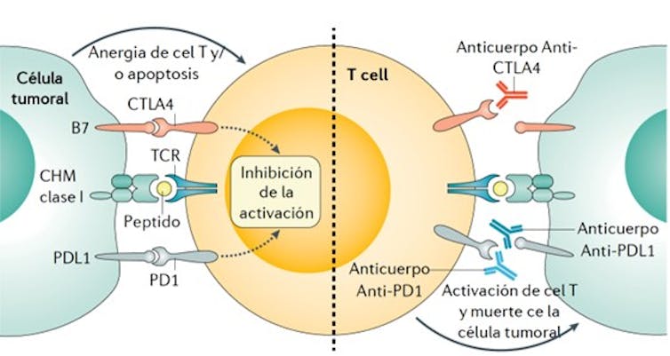 Cuando las células T son estimuladas por un antígeno –una sustancia extraña al organismo–, expresan en su superficie unas moléculas PD (receptores de muerte programada) que evitan una sobreactivación del sistema inmunológico. Pero cuando sus ligandos (PD-L1/2), expresados habitualmente por células dendríticas o macrófagos, se unen a ellos, se produce una señal de desactivación.
