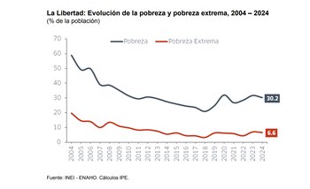 Entre 2023 y 2024, la tasa de pobreza en La Libertad se redujo de 31.6% a 30.2%, por lo que 27 mil liberteños salieron de esta situación. Sin embargo, la pobreza en la región se mantiene por encima del promedio nacional (27.6%) y lejos de su nivel de 2019 (24.7%). Así, se estima que aún hay 142 mil liberteños más en situación de pobreza a partir de la pandemia.