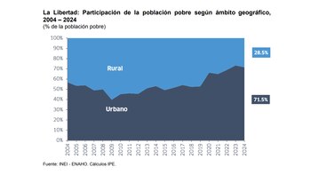 Tras la pandemia, la pobreza en el Perú se ha concentrado en las zonas urbanas y La Libertad no ha sido la excepción. En esta región, la proporción de la población pobre que vive en zonas urbanas pasó de 53.0% en 2019 a 71.5% en 2024, lo que representa un incremento de más de 192 mil personas en situación de pobreza urbana.